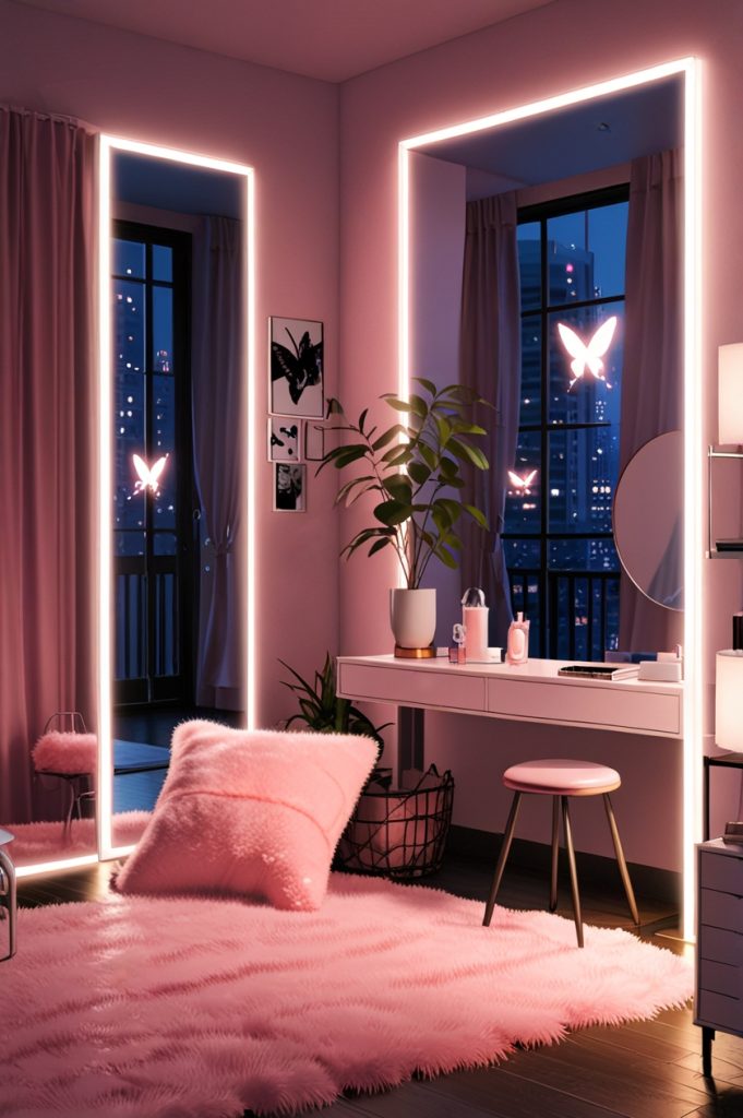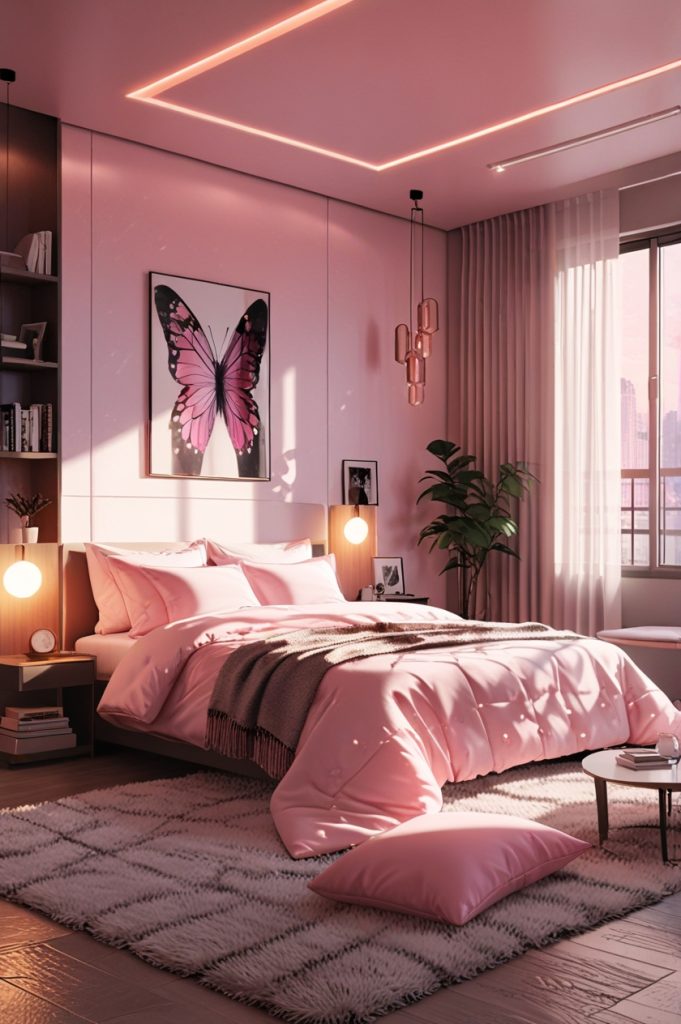 A chic modern pink bedroom can balance bold style with cozy comfort, creating a space that feels both trendy and inviting. This design features elegant butterfly wall art paired with a glamorous LED vanity mirror, adding a touch of sophistication and glamor. Plush faux fur accents and a knitted throw blanket contribute warmth and texture, elevating the room’s cozy aesthetic.