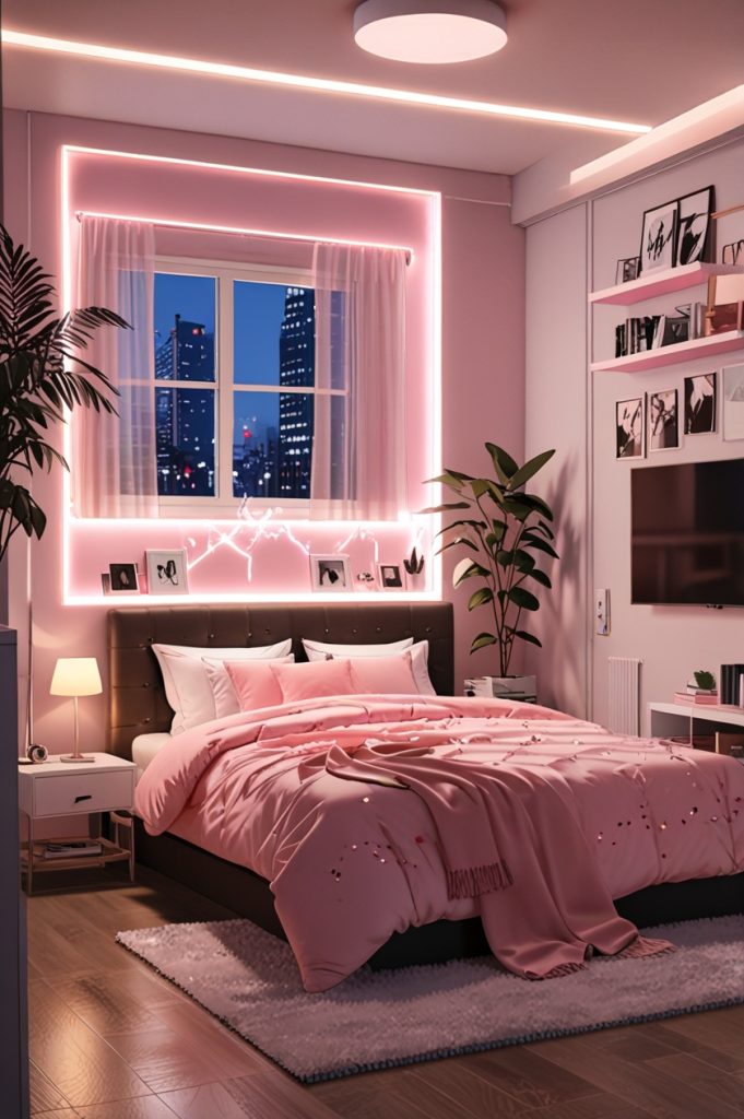 Bold black and blush pink tones combined with ambient LED ceiling lighting set a stylish and relaxing vibe, ideal for a teen girl looking to express personality through her bedroom décor. The interplay of these colors and lighting enhances the modern appeal while maintaining a soft, welcoming atmosphere. This blend of chic elements and comfortable touches offers practical inspiration for those aiming to design a girly yet sophisticated living space.