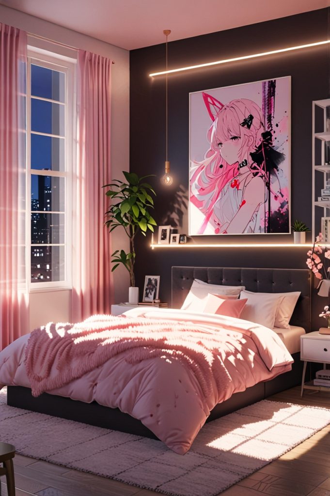 Chic Pink Bedroom with Cozy Aesthetic, Wall Art & Lighting