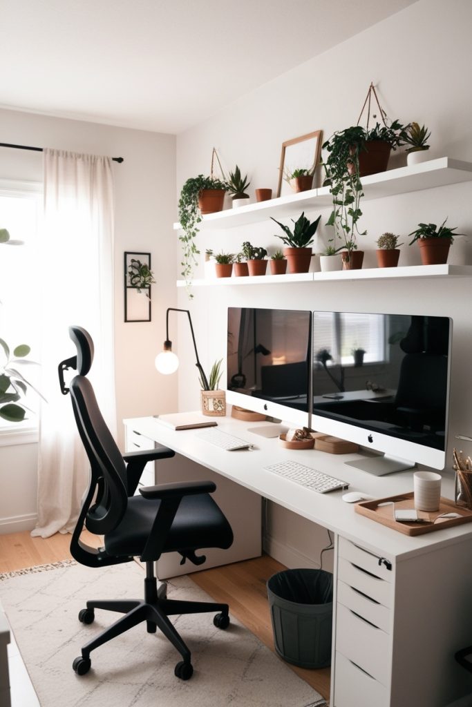 Plants on floating shelves or beside the desk enhance tranquility and connect the space to nature. Combining these elements results in a balanced workspace that supports mental clarity and sustained productivity.