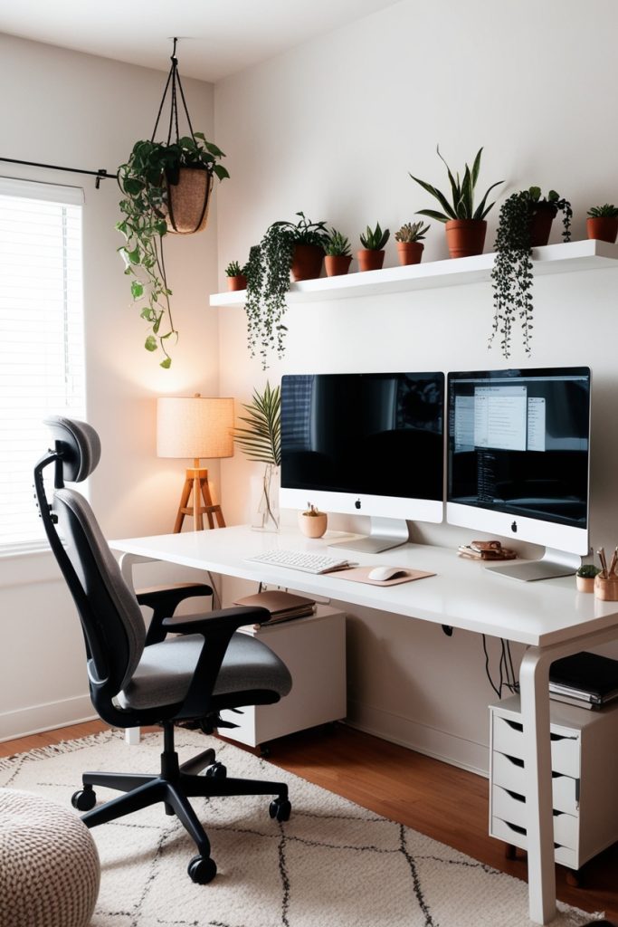 A modern minimalist home office setup can significantly enhance focus and efficiency by combining simplicity with functionality. This workspace features a Scandinavian-style ergonomic chair, floating shelves adorned with indoor plants, and a clean desk arrangement equipped with dual monitors. Such a design prioritizes natural light, cozy accent lighting, and smart organization to create an environment that supports both comfort and productivity.