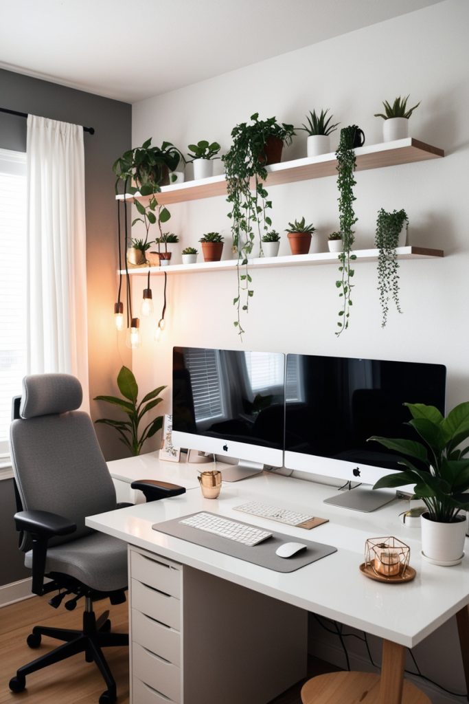 Placing potted plants on floating shelves or near windows allows them to receive indirect sunlight, enhancing both aesthetics and mood. Grouping plants of various heights creates visual interest without cluttering the desk.